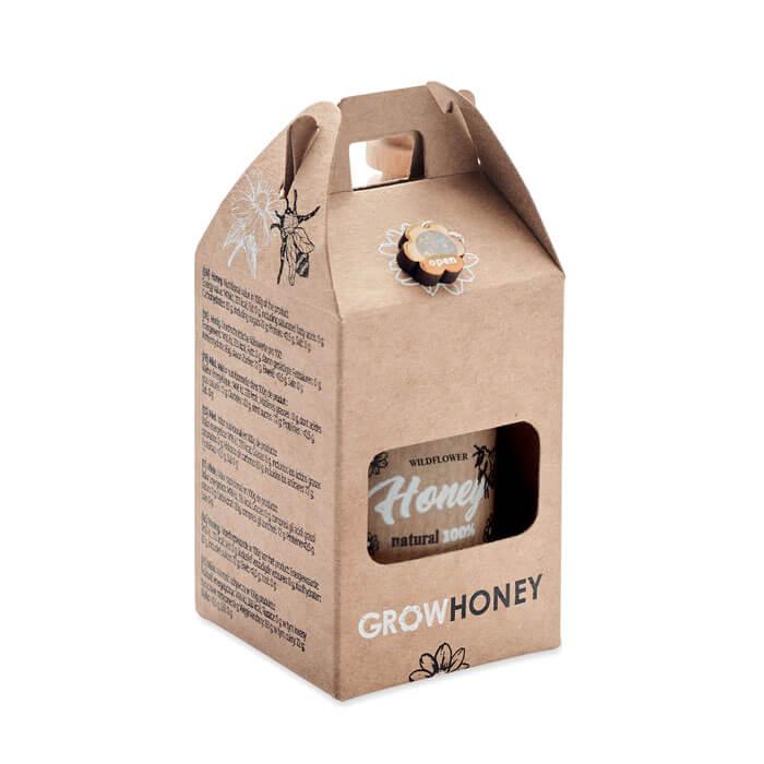 Frasco de mel de flores silvestres (50g) com uma víbora de mel de madeira. Vem numa caixa de papel kraft. Incluindo sementes de flores de abelhas. Fabricado na UE.
