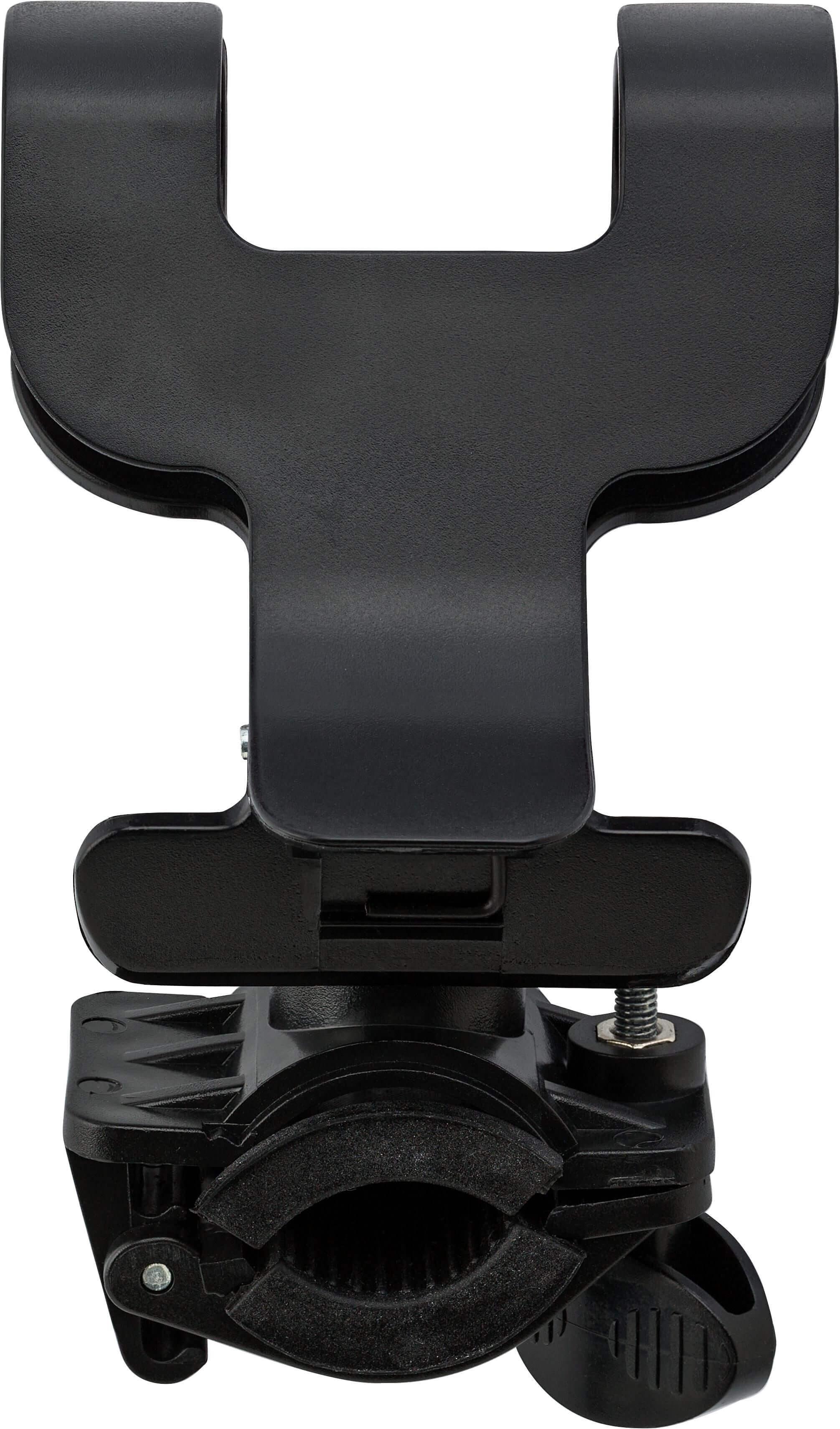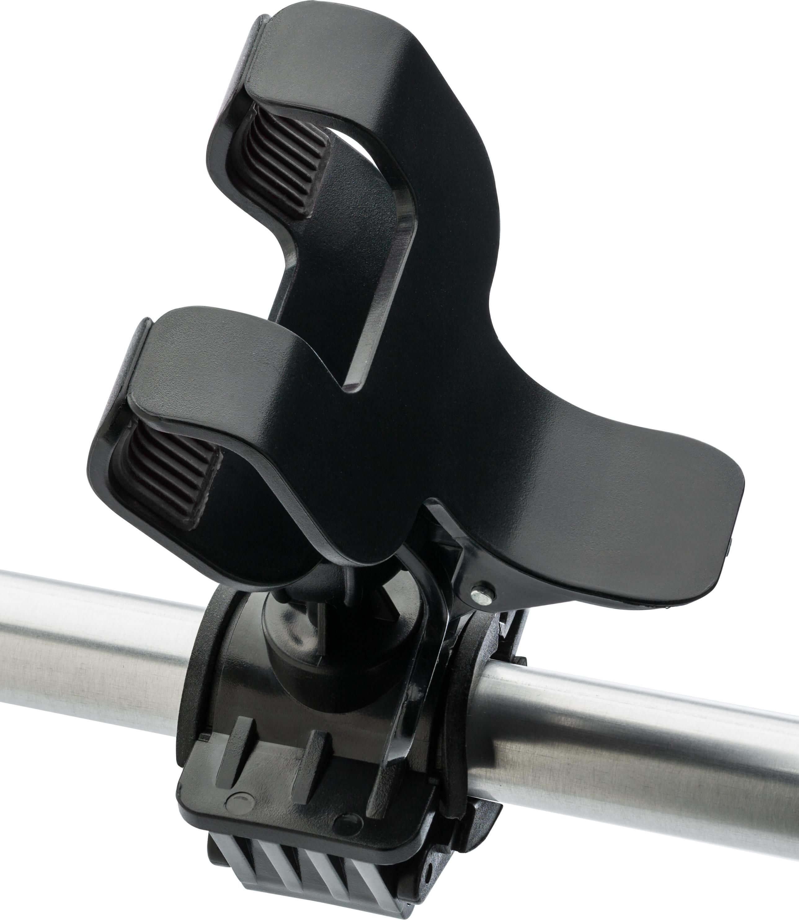 Suporte telemóvel ajustável para bicicleta. O braço para assegurar o telemóvel se move em diferentes posições. O suporte pode ser colocado no guidão e ajustado. O diâmetro máximo da haste situa-se entre 15 e 19 mm e a abertura máxima do suporte para telemóvel é de 9 cm.