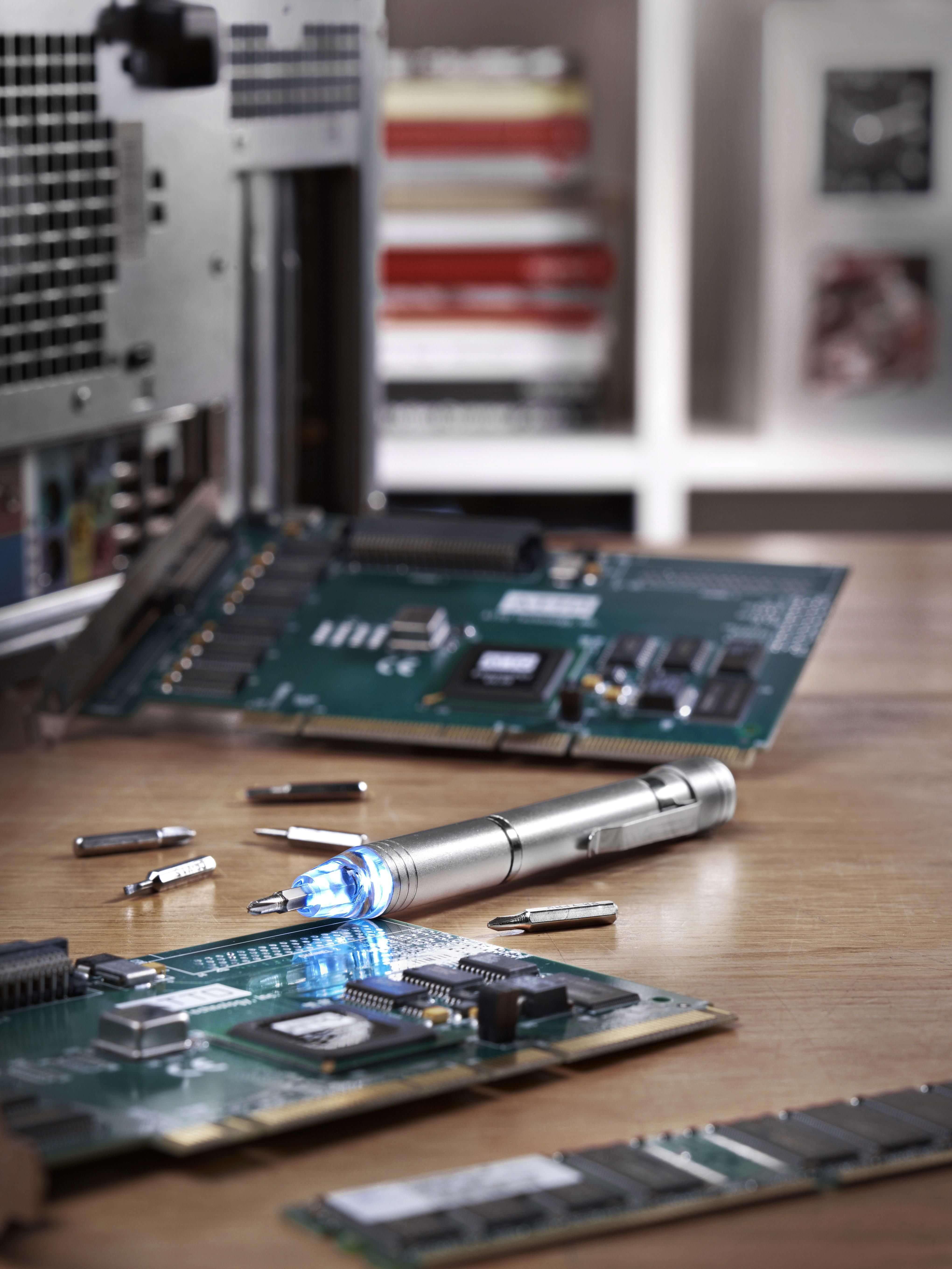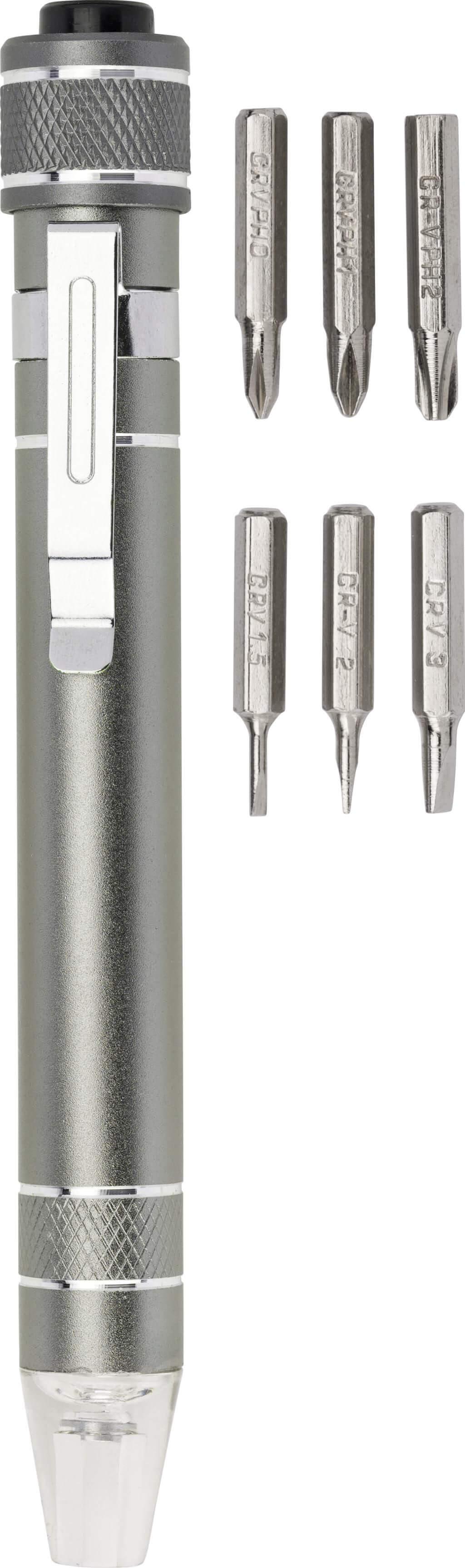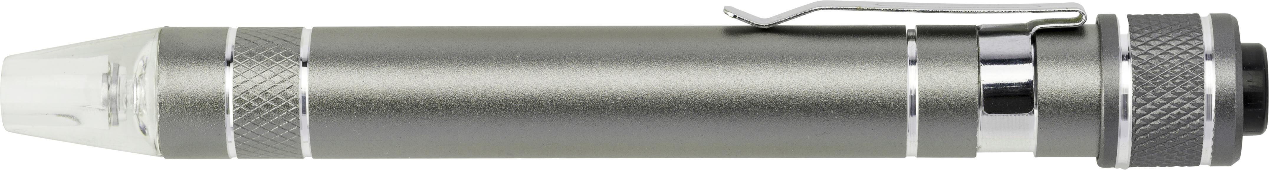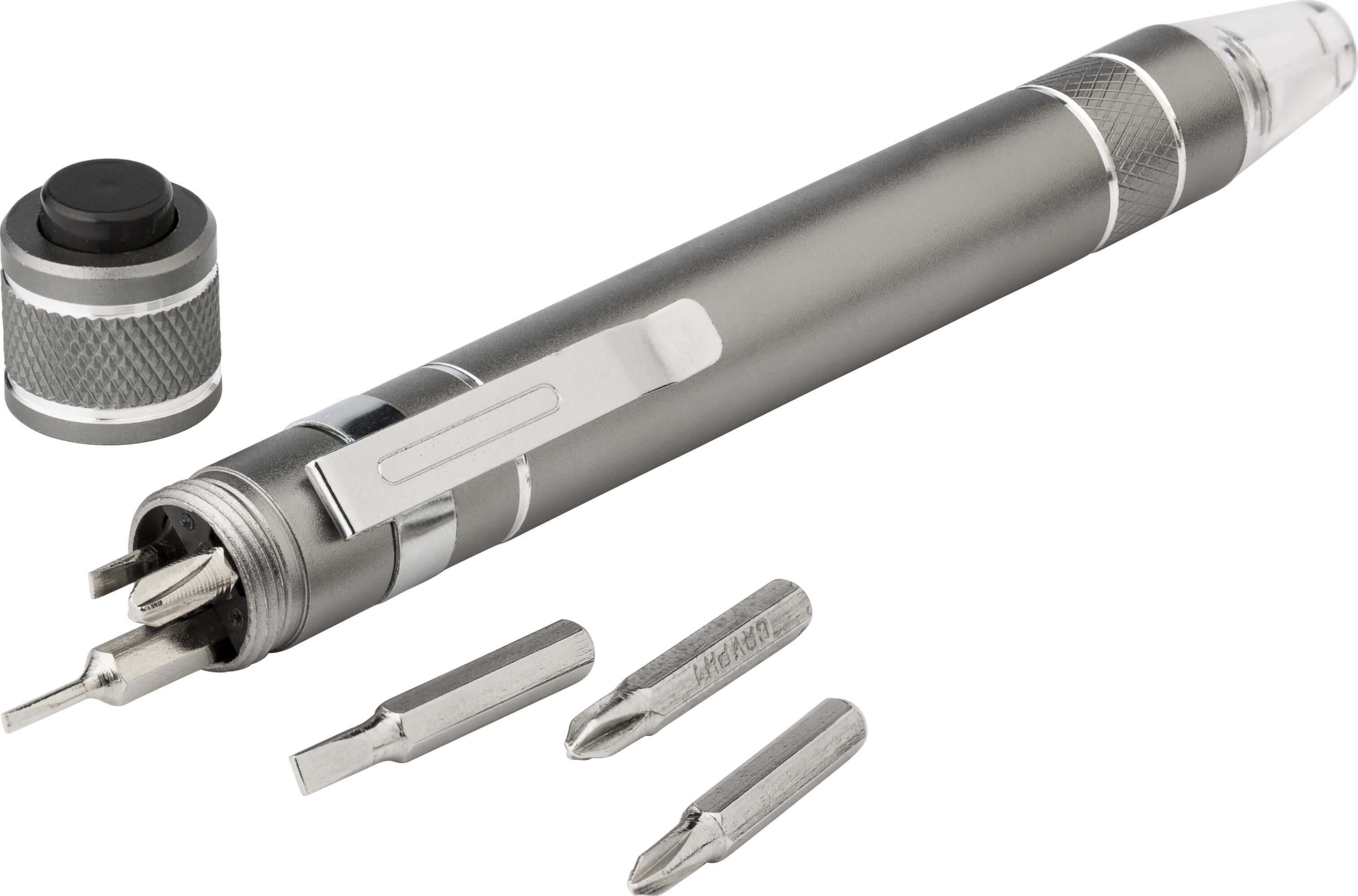 Suporte de metal em forma de esferográfica com luz. No topo contém 6 cabeças de chave de fenda