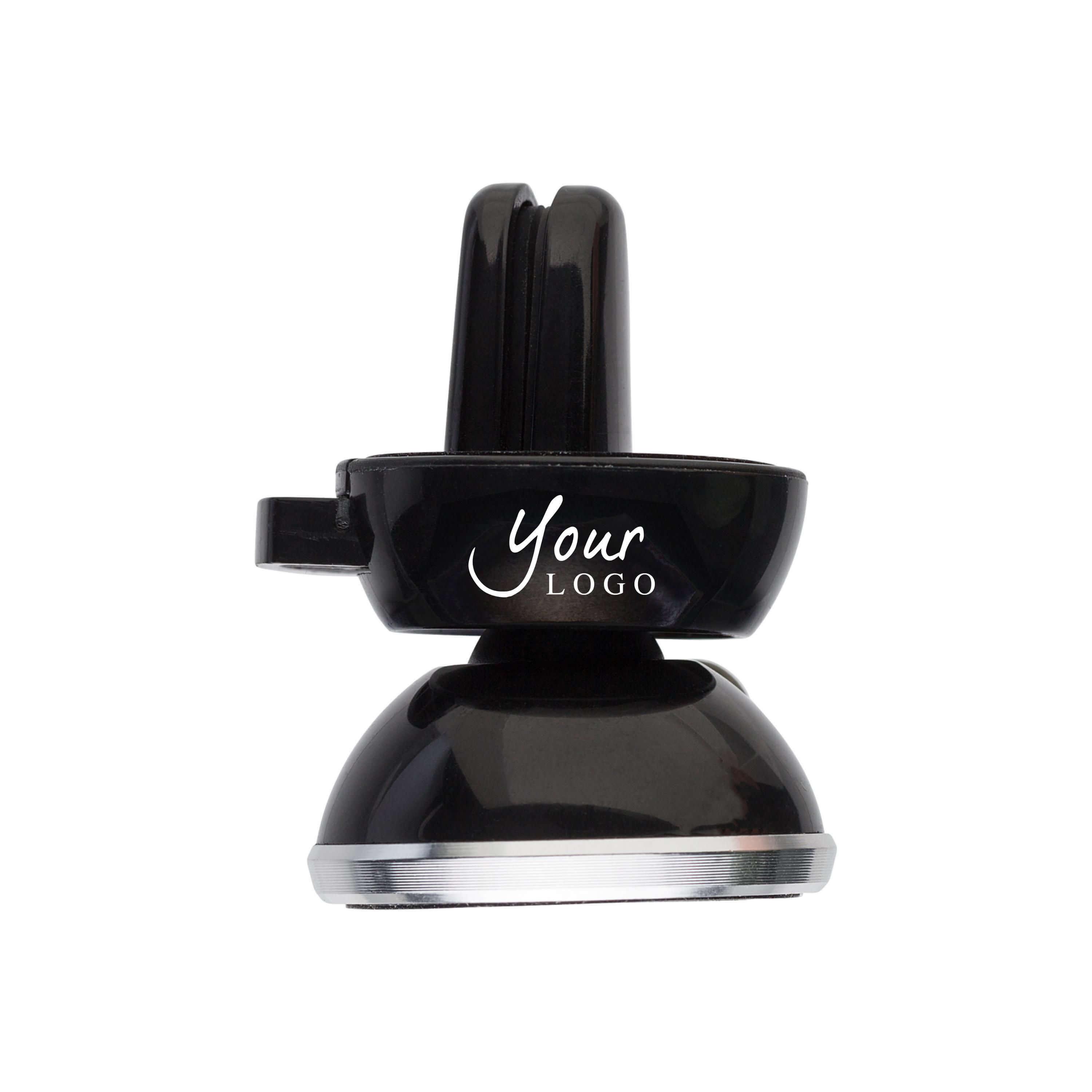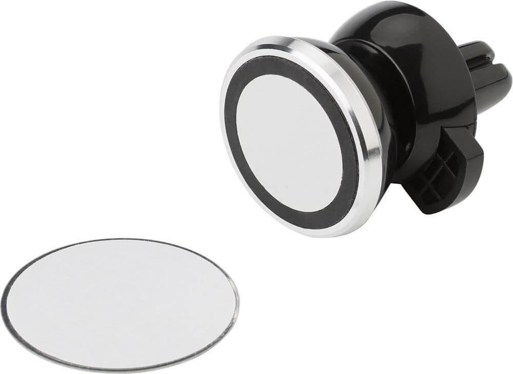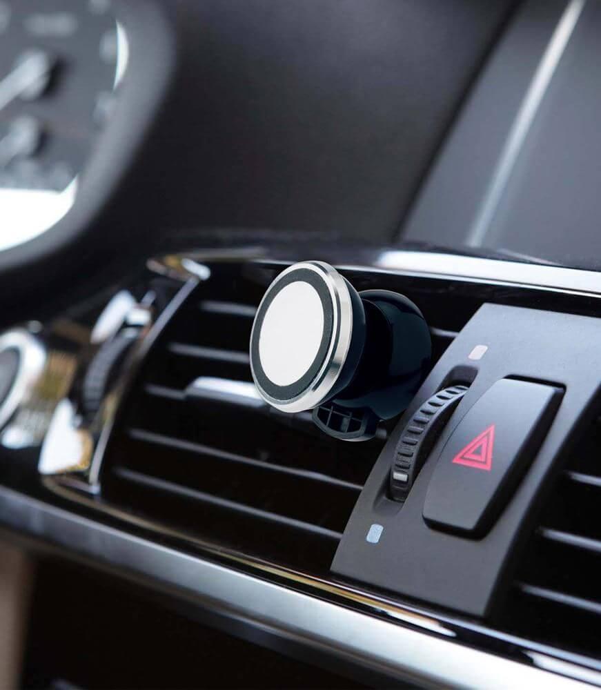 Suporte de telemóvel para o carro, em ABS. Se coloca na saida de ar do carro com a ajuda de um ímã e uma etiqueta adesiva de metal leva para ajustar o telemóvel