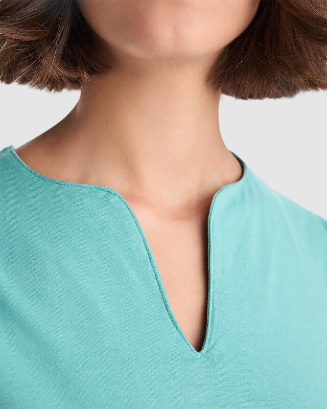 T-shirt justa com gola redonda e abertura em V na frente. Meia manga e costuras laterais recortadas. Tecido de alta qualidade para um toque suave e agradável. Etiqueta amovível. O modelo tem 179 cm e está a usar o tamanho S.