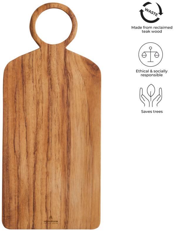 Tábua de corte durável e segura para alimentos, feita a partir da raiz de uma árvore de teca, um produto residual da indústria da teca. Provém de plantações de teca certificadas na Indonésia e é feita à mão por artesãos numa pequena oficina rural em Java Oriental. Pode ser utilizado para cortar alimentos ou como tabuleiro de servir. O design minimalista e natural desta tábua de cortar é uma joia em qualquer cozinha. Tamanho: 41 x 17 x 2 cm.