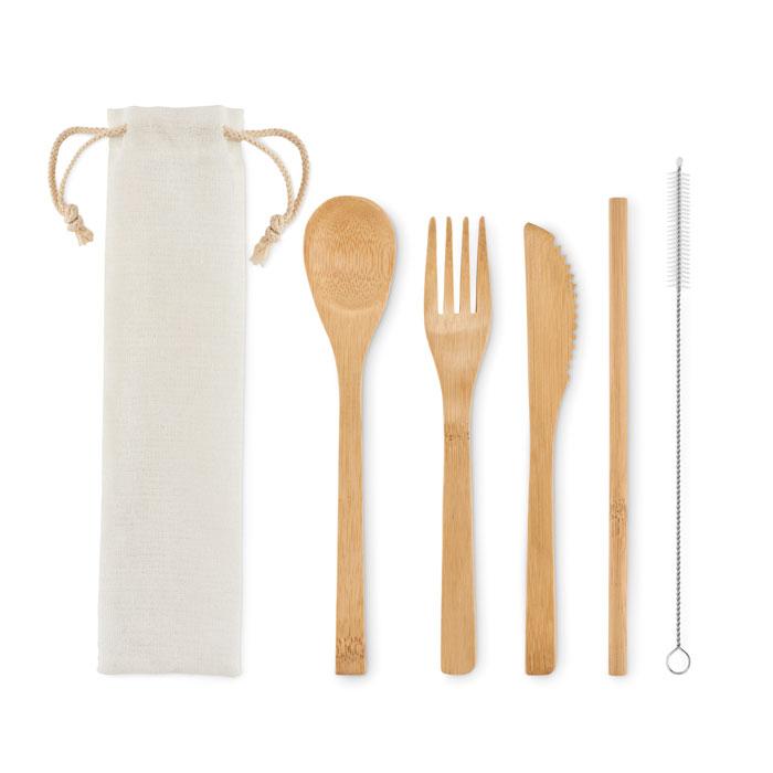 Conjunto de talheres em bambu reutilizáveis em saco de lona. Inclui faca, garfo, colher e palhinha em bambu e escova em aço inoxidável. O bambu é um material natural, a cor do item, o tamanho e a impressão podem variar.