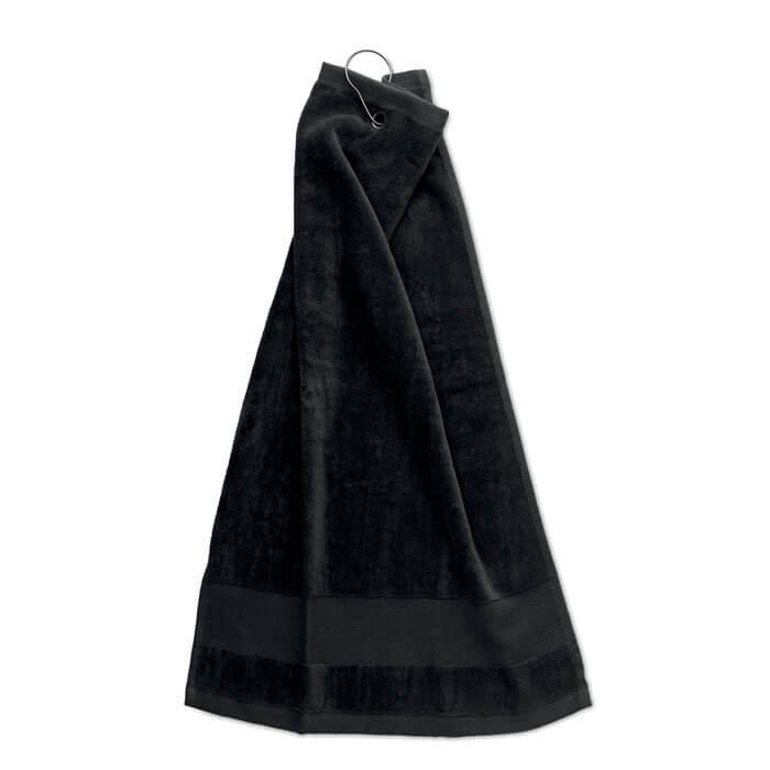 Toalha de golfe de algodão com um anel no topo e meio como cabide. 350 gr/m². Tamanho da toalha: 40×60 cm.