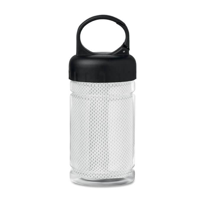 Toalha esportiva de microfibra, apresentada em embalagem individual PET transparente com tampa e mosquetão de transporte integrado. Capacidade da garrafa = 300 ml, tamanho da toalha = 30 x 80 cm