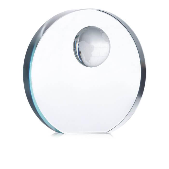 Elegante troféu em forma de esfera em cristal, relevo simulando metade do globo terráqueo na parte superior. Apresentado numa caixa clássica de presente.