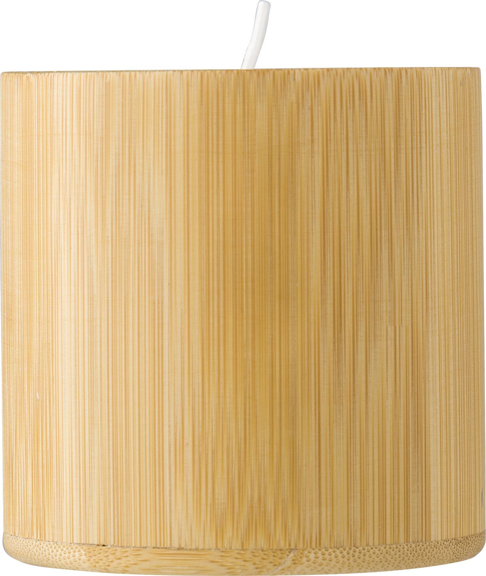 Vela de bambu com cera à base de plantas. A vela contém principalmente cera à base de plantas (cera de carnaúba) e tem uma duração de combustão de cerca de 30 horas. Apresentado individualmente num saco de papel.