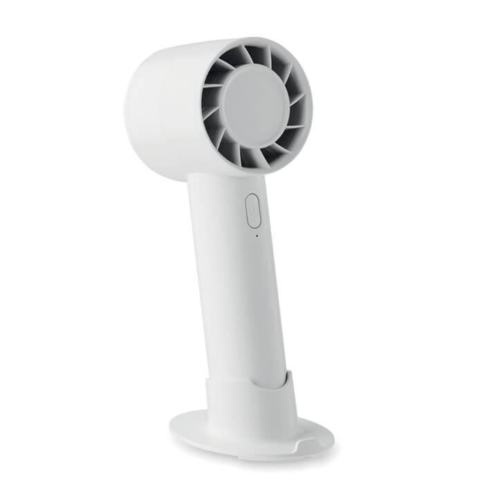 Pequena ventoinha portátil com suporte de secretária e suporte para telemóvel. 3 níveis de velocidade. Bateria recarregável com porta USB de 2000 mAh.